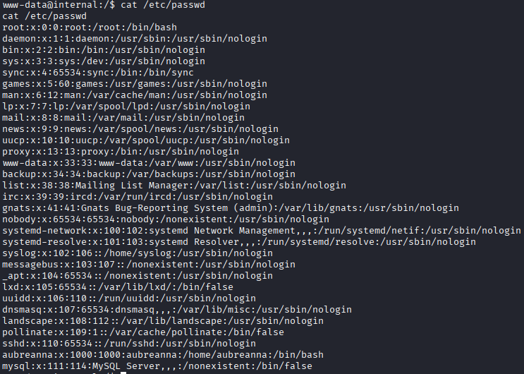 A partir de ce moment-là, je découvre dans un premier temps manuellement mon environnement et je remarque l’existence d’un user aubreanna (via le fichier passwd, ainsi que par la présence de son dossier personnel dans /home).