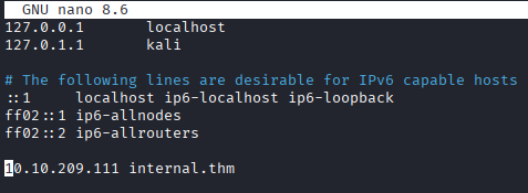 Je crée donc une ligne de résolution DNS manuelle dans le fichier hosts pour le nom internal.thm.