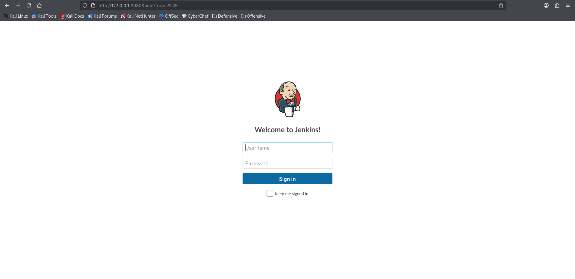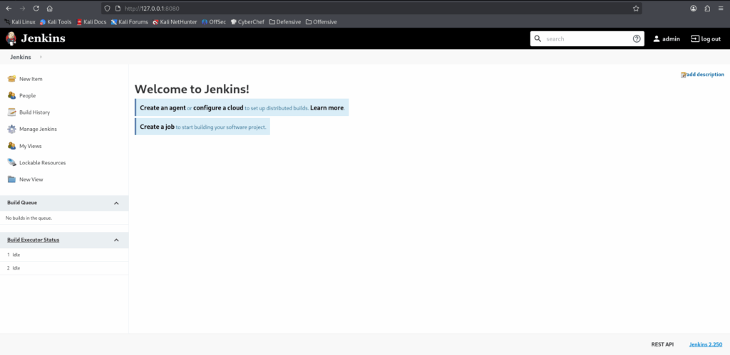 J’ai désormais accès à l’interface Jenkins depuis ma machine d’attaque via mon localhost sur le port 8080 !