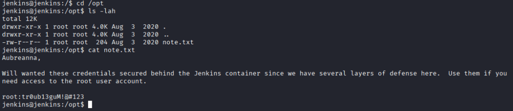 Petite impression de déjà-vu, je trouve un fichier énigmatique note.txt dans le dossier /opt, je décide de l’ouvrir et j’obtiens alors le sésame !