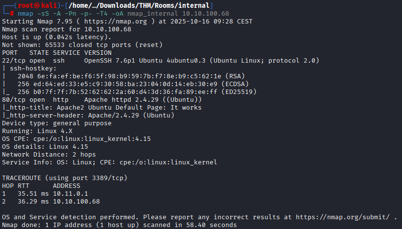 - -p- : Scan l’intégralité des ports possibles.