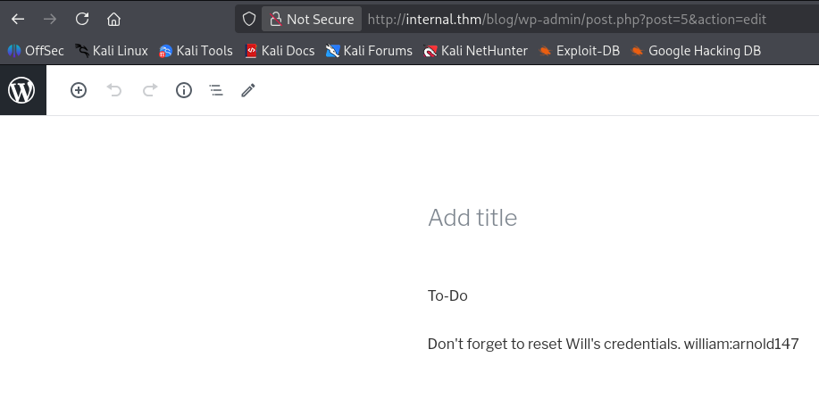 J’obtiens une paire d’identifiant/mot de passe : william / arnold147, avec un message « à faire » laissé, indiquant qu’il ne faut pas oublier de réinitialiser les accès d’un certain « Will« .