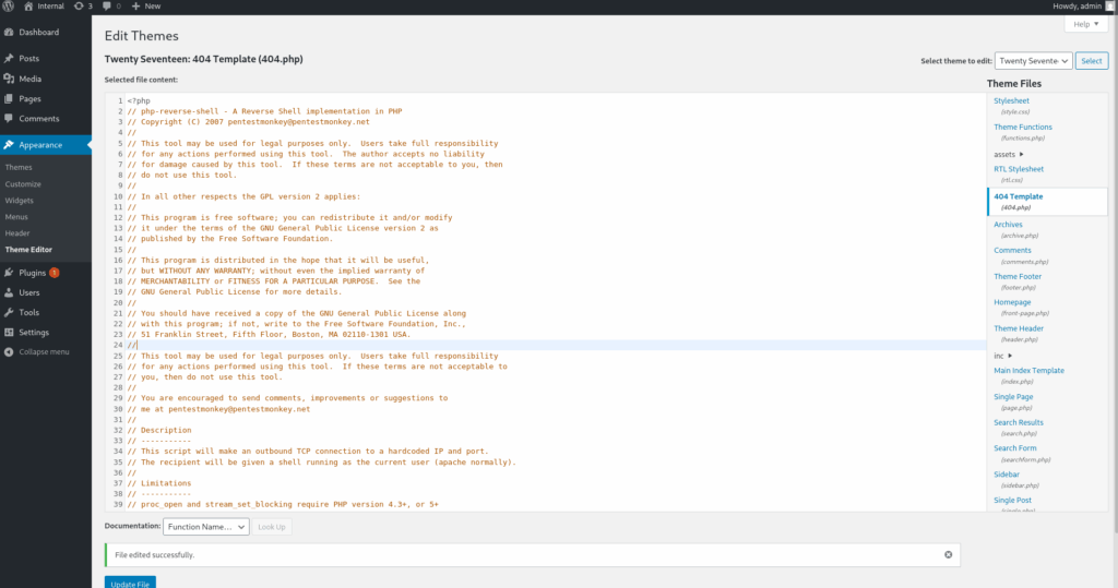Ayant accès au panel administrateur de l’instance WordPress, je décide d’uploader un reverse shell en remplaçant la page d’erreur 404 par exemple.