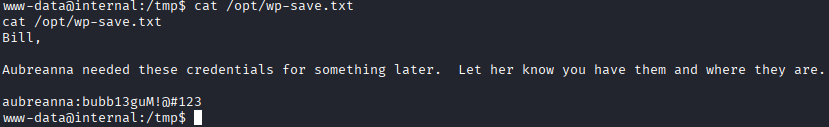 Je trouve grâce au script un fichier wp-save.txt étrange dans le répertoire /opt et décide d’y jeter un œil et il me donne alors une information précieuse :